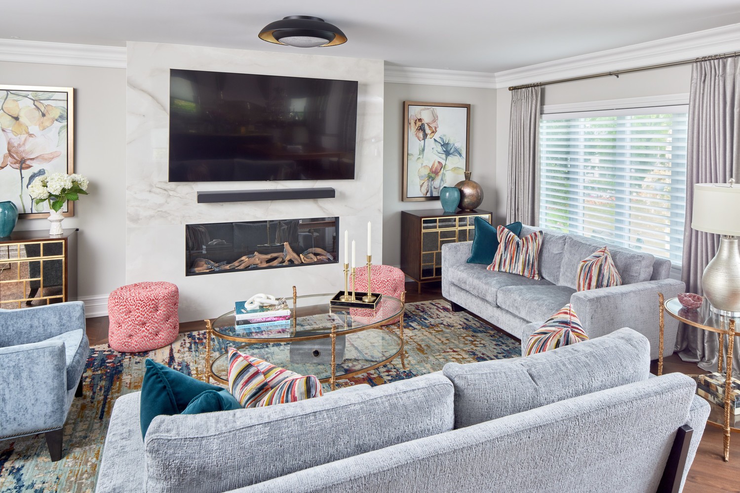 These past clients wanted to renovate and redecorate their 25-year-old family room, primary bedroom, and ensuite. They wanted a vibrant and fresh colour palette for the family room. We replaced the flooring, designed a floor-to-ceiling fireplace, and provided new furnishings and décor. In the bedroom and ensuite, they wanted a fresh and spa-like colour palette. Both function and beauty were important to them. +We changed the ensuite layout to allow for a large walk-in shower and two vanities. Beautiful wallpaper and finishes adorn this new space. The bedroom was given a major facelift. New furniture, bedding, drapery, and wallcoverings provide them with a bedroom to retire to at night.